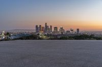 This image captures the view of Los Angeles, California, from an empty parking lot at sunset. The cityscape showcases the impressive modern architecture of skyscrapers against the backdrop of a clear sky. As the sun sets, artificial lights begin to illuminate the city, creating a beautiful contrast between dark and light. The open space of the parking lot allows for a panoramic overview of the city, while the surface of the asphalt reflects the city's hustle and bustle. This photo represents the vibrant city life and urban design of Los Angeles.