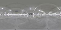 Aerial view of an empty parking lot in Los Angeles at night. The concrete surface is illuminated by street lights, creating a bright and open space. The high position offers a unique perspective of the suburban area.
