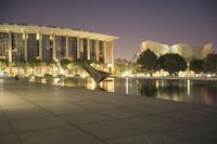 This image captures the modern architecture of a large building in Los Angeles, California. The cityscape is illuminated by artificial light, reflecting beautifully on the surface of the nearby lake. The clear night sky provides a dramatic backdrop for the urban scene. In the foreground, a bench invites viewers to relax and enjoy the view. This photo represents the vibrant and dynamic city of Los Angeles, with its iconic skyline and blend of natural and architectural elements.
