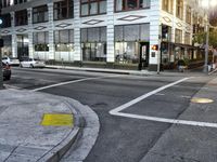 Nighttime in Los Angeles, California. Classic architecture surrounds an intersection with a traffic light and red stop sign. The vibrant yellow lines pop against the dark road. Restaurants and bars offer a lively atmosphere in this urban cityscape.