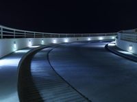 A night view of the iconic architecture and cityscape of Los Angeles, California. The city lights reflect on the water, illuminating the buildings and bridges. The dark night sky contrasts with the metal structures and the blue hue of the city lights.