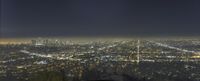 A breathtaking aerial view of the vibrant city of Los Angeles at night. The cityscape is illuminated by the dazzling lights, creating a stunning contrast against the dark sky. The elevated viewpoint provides an expansive overview of this bustling metropolis.