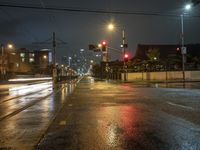This is an image of a cityscape in Los Angeles, California, USA. The photo captures the urban design and city life of the area. The grey sky adds to the gloomy atmosphere of the scene, while the artificial lights from the streetlights and buildings illuminate the city streets. The roads and bridges are wet from rain, creating a reflective surface on the asphalt. In the distance, the skyline of skyscrapers can be seen. This photo represents a dark and gloomy night in the city.