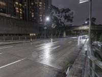 Nighttime view of Los Angeles cityscape. The modern architecture and towering skyscrapers are beautifully reflected in the wet road surface. The city comes alive with the glow of street lights and the vibrant energy of the urban landscape.
