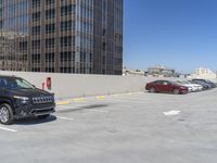 A modern office building in downtown Los Angeles, California. The clear sky highlights the sleek architecture and concrete streets. The urban landscape is filled with parked vehicles in the busy business district.