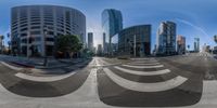 A straight road in downtown Los Angeles, lined with skyscrapers and iconic architecture. The yellow lines on the asphalt reflect the vibrant city life. A perfect representation of California's urban design.