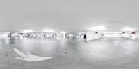 Panoramic view of an empty parking garage in the underground area of Los Angeles at night. The high ceilings, white walls, and artificial lights create a spacious and urban atmosphere.