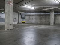 A parking garage in Los Angeles, California, with a no dumping sign and a yellow bench area. The concrete floor reflects the artificial light, creating a vibrant atmosphere in this urban public space.