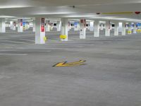 a parking garage with a sign on the floor near an arrow painted in concrete, and three parking spots are in the floor