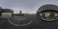 a 3d photo of a parking lot with circular buildings on either side of them in the evening