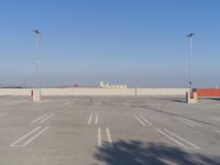 A modern parking lot in Los Angeles, California. Tall lamp posts illuminate the vast concrete space. Clear skies and the horizon create a beautiful urban backdrop. The perfect spot to park in the city of dreams.