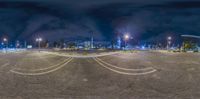 A view of a parking lot in Los Angeles at night, illuminated by street lights and artificial light. The metropolitan area is highlighted by the straight road leading to a residential area. The dark sky contrasts with the blue lights of the parking deck.