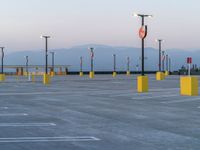 a parking lot filled with lots of parking lamps and poles near a mountain range in the background