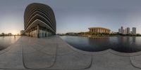 Distorted reflection of Los Angeles skyline on water, creating a unique urban landscape. Clear sky and sunlight add a touch of warmth to the cityscape. Mixed-use buildings and high-rises dominate the downtown area.