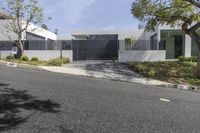 This image showcases a residential street in Los Angeles, California. The modern architecture of the gray buildings blends seamlessly with the straight road surface. Lined with trees, shrubs, and bushes, this neighborhood exudes a suburban vibe. The clear sky above is streaked with contrails, adding a touch of urban charm. The house in focus features a gated entry and a well-maintained front yard. With its convenient location and attractive design, this property is a prime example of real estate in Los Angeles.