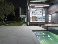 This is an image of a modern low-rise residence in Los Angeles, California. The architectural design features a concrete facade and clean lines. At night, the building is illuminated with artificial light, highlighting the modern aesthetic. The surrounding residential area offers a mix of nature and urban design. The property includes a swimming pool with a tiled surface, providing a recreational space for residents. Inside, the interior design showcases a spacious room with a dark color scheme. This photo represents the blend of modern architecture and urban living in Los Angeles.