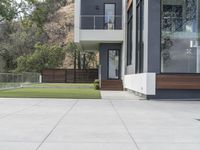 This is an image of a modern residential villa in Los Angeles, California, USA. The architecture showcases a sleek and stylish design with clean lines and a unique facade. The villa is surrounded by a well-maintained grass surface and a beautiful garden in the backyard. The concrete surface of the building adds to its modern appeal. This photo represents a typical day in a residential area of Los Angeles, highlighting the beauty of modern architecture and the importance of outdoor spaces in California living.