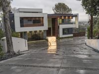 Modern villa in Los Angeles, California. The sleek architecture and concrete facade shine under the grey sky. A straight road leads to the residential area, surrounded by trees and wet surfaces.
