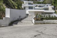 This is an image of a modern residential building located in Los Angeles, California, USA. The building has a sleek and contemporary design with concrete walls, a flat roof, and large windows. Surrounding the building are well-maintained trees and a concrete street. The image captures a typical day in an urban residential area in Los Angeles. The building represents the modern architecture and urban design that is prominent in the city. This photo highlights the real estate and property in Los Angeles, showcasing the suburb's residential area and its entryway.