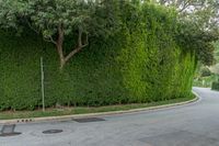 a car driving past a hedge lined wall on a residential street with parking space for motorists