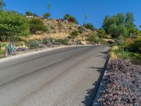 flowers growing next to a road with a dirt path between them with grass and a hill in the background