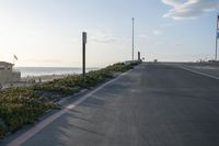 A straight road leading to the coast in Los Angeles, California. The dawn sun illuminates the asphalt as it meets the sandy beach. Residential houses line the shore, creating a picturesque suburban scene.