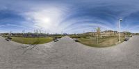 A modern skate park in Los Angeles, California. The fish-eye view captures the vibrant city skyline, contrasting with the lush green open spaces. People walking and benches create a lively atmosphere in this urban oasis.