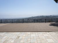An aerial view of the Los Angeles skyline with the Hollywood Hills in the background. The clear blue sky reflects in the surface of the swimming pool. Cobblestone walkways lead to wooden floors for recreational activities. An overview of urban design in California.