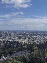 This aerial view of the Los Angeles skyline showcases the modern architecture and vibrant city life of California's largest metropolitan area. The cityscape is beautifully framed by the majestic mountain ranges, highlighting the unique blend of urban and natural environments. The high-rise skyscrapers reach towards the sky, reflecting the eclectic urban design of this coastal city. With its elevated perspective and stunning panoramic view, this photo captures the bustling energy and scenic beauty of Los Angeles on a sunny day.