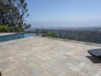A stunning view of the Los Angeles skyline from a deck overlooking a swimming pool. The clear sky enhances the classic architecture of the residential buildings. A perfect spot for a relaxing vacation in Beverly Hills.