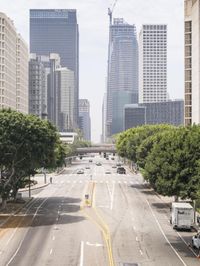 A vibrant cityscape of Los Angeles, California, USA featuring tall skyscrapers, modern architecture, and a busy road lined with street signs. The image captures the bustling urban life with vehicles and pedestrians moving along the asphalt road. The towering buildings and business district create a stunning skyline against the clear sky. The presence of vegetation and trees adds a touch of greenery to the city landscape. The photo is taken from a top-down perspective, showcasing the impressive infrastructure and urban design of the city. The image also captures the straight road leading into the distance, giving a sense of depth and perspective. The bright daylight illuminates the scene, casting shadows and highlighting the details of the buildings and street. This stock photo perfectly represents the energetic and dynamic atmosphere of Los Angeles.