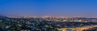 A breathtaking view of Los Angeles at twilight, taken from an observation point. The city skyline is illuminated by artificial lights, creating a stunning cityscape. The open space and modern architecture showcase the urban charm of this iconic destination.
