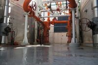 A view of a straight road in Los Angeles, California. The low architecture and industrial structures contrast with the open space. Sunlight casts shadows on the wet concrete, creating a unique atmosphere in this sunny day.