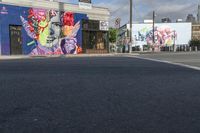 A vibrant cityscape in Los Angeles, with colorful murals and street art adorning the walls. The urban design showcases the city's unique charm. Suburban streets lined with graffiti walls and parking lots create an artistic atmosphere.