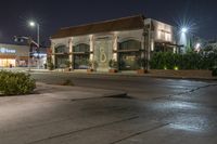 This is an image of a residential area in Los Angeles, California, USA. The photo captures a night scene with the city lights illuminating the classic architecture of the buildings. The road, lined with street lights and traffic lights, is made of asphalt. A tree can be seen near the curb, adding a touch of nature to the urban setting. The mixed-use property features a restaurant and cafe, providing a vibrant city life. This photo represents the art district of Los Angeles, where residents and visitors can enjoy dining and exploring the city's unique urban design.