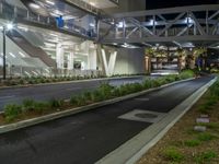 A dark and night scene in Los Angeles suburbs, with artificial light illuminating a quarter of the road and parking lot. The street lights create a moody and suburban atmosphere.