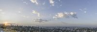 A beautiful dawn in Los Angeles, California. The clear blue sky and cumulus clouds create a stunning atmosphere. Modern architecture and suburban homes line the road, with Armco barriers adding to the urban design.