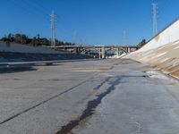A suburban road in Los Angeles, California with a clear sky above. The road leads to a bridge over the river, passing by concrete walls. Power lines run above, creating an urban landscape.