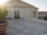 This is an image of a residential building in Los Angeles, California, USA. The classic architecture of the building is complemented by a sandstone wall entrance and benches in front of it. The image was taken at sunset, with the warm sun shining on the facade and walkway. In the background, clear skies create a serene atmosphere. The building represents the charm of suburban living in Los Angeles. It could be a home, a villa, a hotel, or even a museum. The image captures the essence of the city's real estate and architectural beauty.