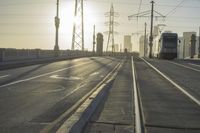 A view of the iconic Sixth Street Bridge in Los Angeles, California. The cityscape features a clear sky with the sun visible, casting a sunny dawn on the road and urban infrastructure. Overhead power lines and Armco barriers line the lane, adding to the urban atmosphere.