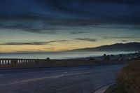 This is an image of a coastal landscape at dawn in Santa Monica, California. The view overlooks the ocean and the beach. The horizon is lit up by the artificial light as the night transitions into the day. The sky is filled with beautiful clouds, and there are contrails visible. The road made of asphalt leads to the shore, providing a scenic route for visitors. The overall atmosphere is emotional and dark, with the changing light reflecting on the water. This photo represents the natural beauty of the California coast at different times of the day.