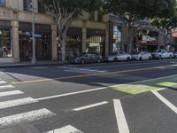 A classic architecture storefront in the urban design of Los Angeles. The tree-lined street showcases the city's famous crosswalks and vibrant shop fronts. This bustling thoroughfare is a symbol of California's urban lifestyle.