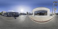 the view from a fisheye lens of a car dealership at an intersection with palm trees in the background