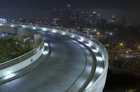 A night view of downtown Los Angeles with its iconic cityscape. The modern architecture and straight roads create a futuristic and urban feel. Artificial lights illuminate the concrete streets and parking garages. The city's highways and ramps are visible as well, adding to the metropolitan atmosphere.