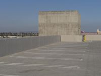 This is an image of a modern architecture building in Los Angeles, California, USA. The building has a concrete facade with rectangular shapes and composite materials. The city landscape shows roads and parking lots made of asphalt and concrete. In the distance, the horizon is visible with a clear sky above. The image reflects the urban design and architecture of Los Angeles, with a blend of modern and ancient history. The parking deck and garage can be seen, showcasing the urban infrastructure. This is a typical day in the city.