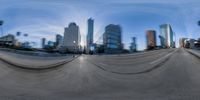 A fisheye lens captures the dynamic cityscape of downtown Los Angeles. Skyscrapers and office buildings tower over the bustling streets lined with trees. The yellow lines on the road add a vibrant touch to the urban design.