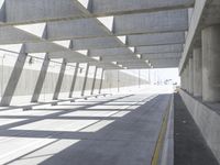 An abstract view of a concrete bridge in Los Angeles. The hard shadow casts a unique light on the urban infrastructure. The city's architecture is showcased in this concrete street, lined with buildings and surrounded by the bustling city.