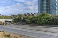 Aerial view of a metropolitan area in Los Angeles, California, USA. The cityscape is filled with modern architecture, residential areas, and tree-lined roads. The high and elevated highways and lanes connect the neighborhoods with the rest of the city. The concrete streets and infrastructure create a bustling and vibrant urban environment. The image captures the busy urban life in a sunny day with clouds in the sky.