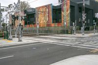 a street corner with a wall mural on the side of it, and a stoplight and pedestrian crossing