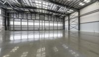 Spacious and bright warehouse with high ceilings and glass-walled ceiling providing ample natural light. Ideal for industrial use, this empty property offers an open space and concrete flooring. Perfect for a factory, parking garage, or airplane hangar.